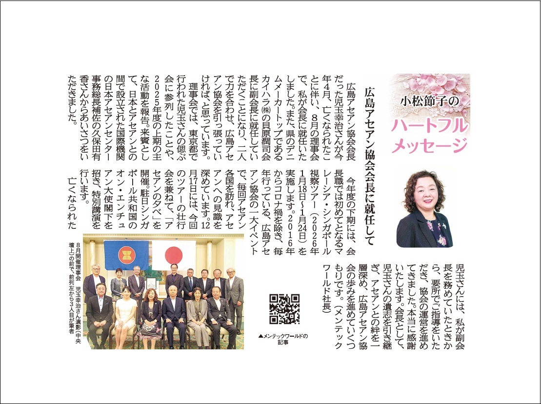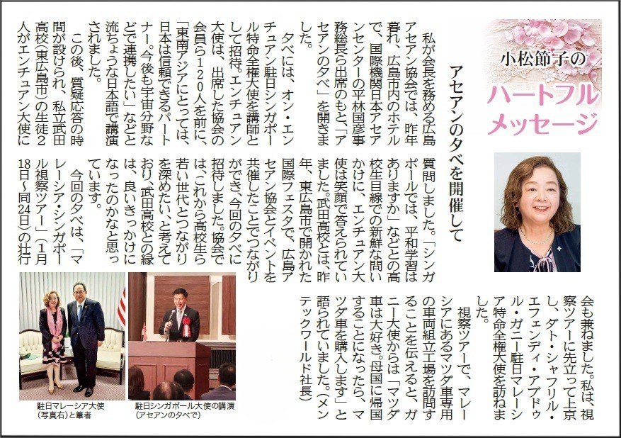 広島アセアン協会は、2013年に設立されました。2013年は日本とアセアン友好協力40周年に当たる記念すべき年でした。当協会は、広島県内の企業や団体ならびにジャイカやジェトロ、国際機関日本アセアンセンターの協力を得て、諸々の活動を積極的に展開してきました。今後ともアセアンとの経済交流、人的交流、文化交流を一層促進して、日本とアセアン、特に広島とアセアンのパートナーシップの強化に貢献していきたいと考えます。