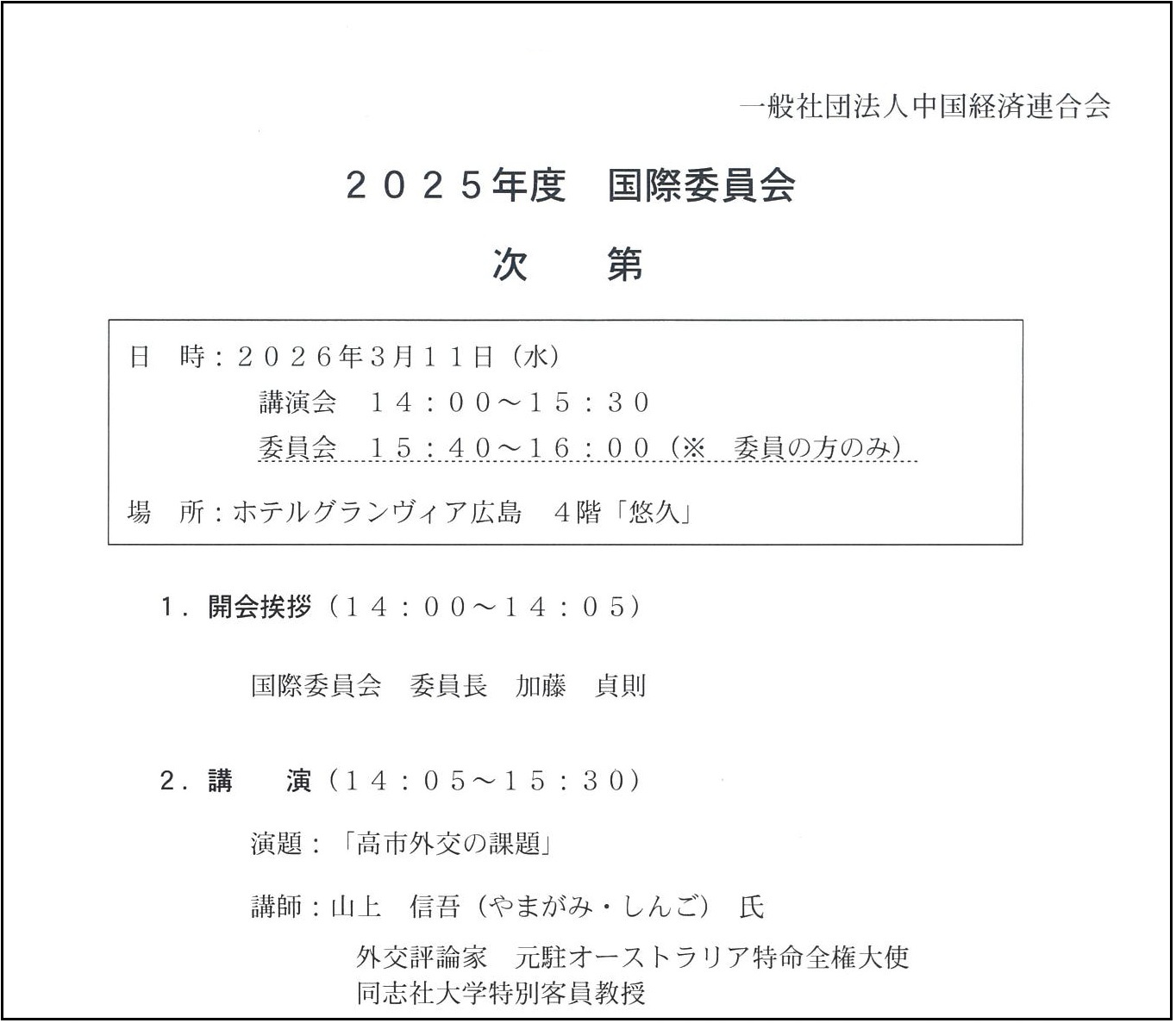 2026年3月11日(水)に、ホテルグランヴィア広島で開催された、「2025年度 国際委員会」に参加…
