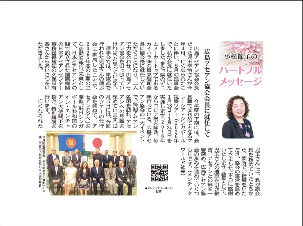 東広島市内の地域情報を発信する情報紙「THE,PRESS/2025年11月27日号・VOL.1269)」に、広島アセアン協会 会長・小松節子の就任および協会活動に関する記事が掲載されました。
