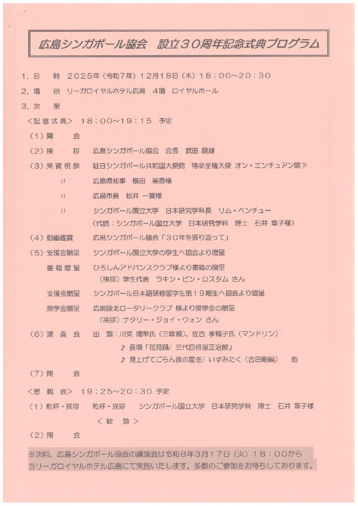 2025年12月18日(木)に、リーガロイヤルホテル広島で開催された、「広島シンガポール協会設立30周年記念式典」に参加しました。