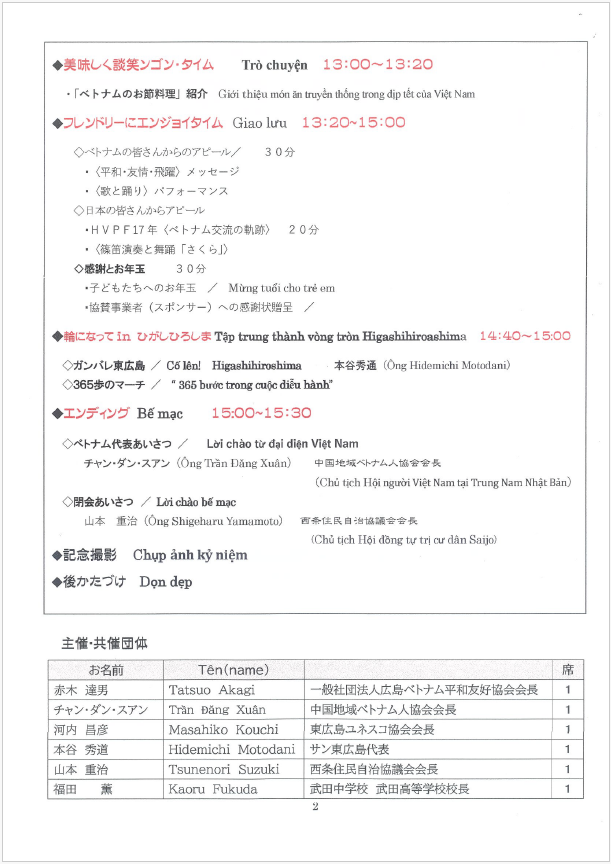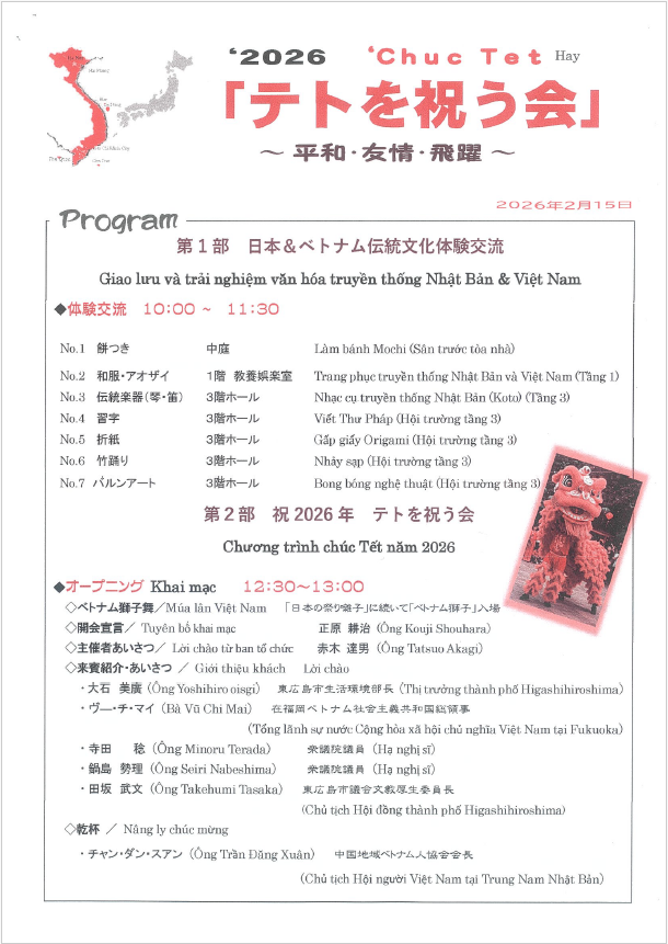 2026年2月15日(日)、広島ベトナム平和友好協会主催により開催された「2026『テトを祝う会』in東広島」に参加しました。